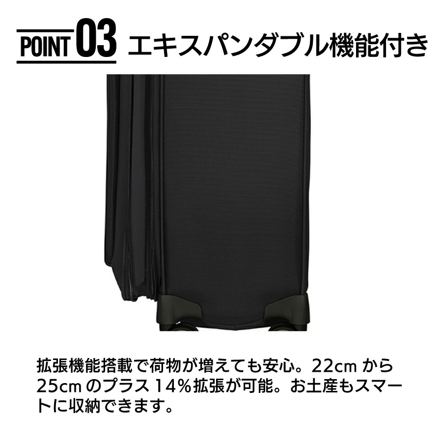 ファスナーを開くだけでマチが広がる安心感は、お土産を買いすぎてしまう「もしも」の時の心強い味方。帰り道、重くなった荷物もサムソナイトの高性能なキャスターが滑らかに運んでくれるので、自宅に帰り着くまで軽やかな気分でいられますよ。