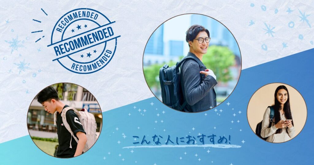 軽量で背負いやすく、長時間の移動でも疲れにくい設計。通勤・通学・普段使いから旅行まで、幅広いシーンで活躍します。